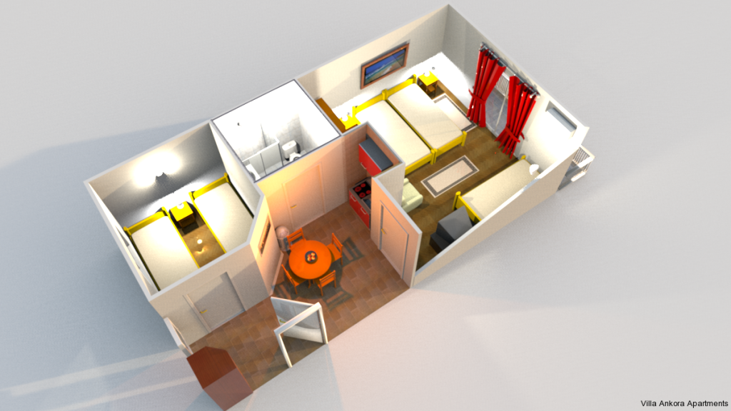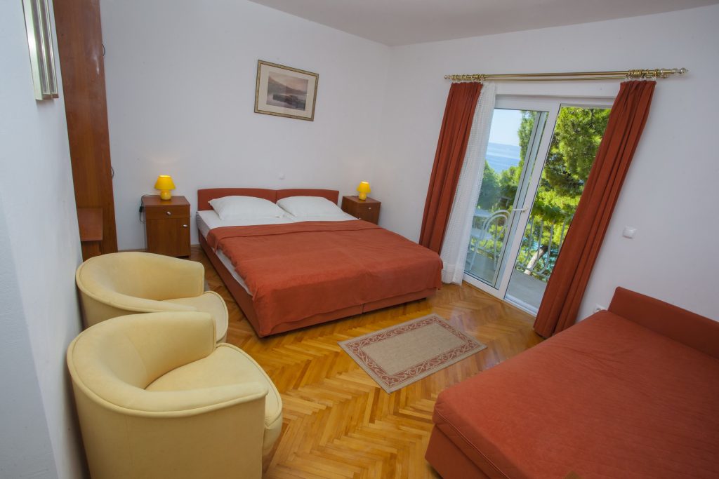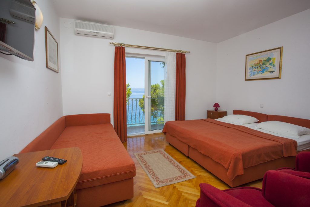 Our apartments come in two types: A for 3+2 people (two bedrooms), and B for 2+1 people (single bedroom). Both apartment types are located on every floor. All our apartments have balconies overlooking the sea. All our apartments are equipped with air-conditioning, WiFi and satellite TV.